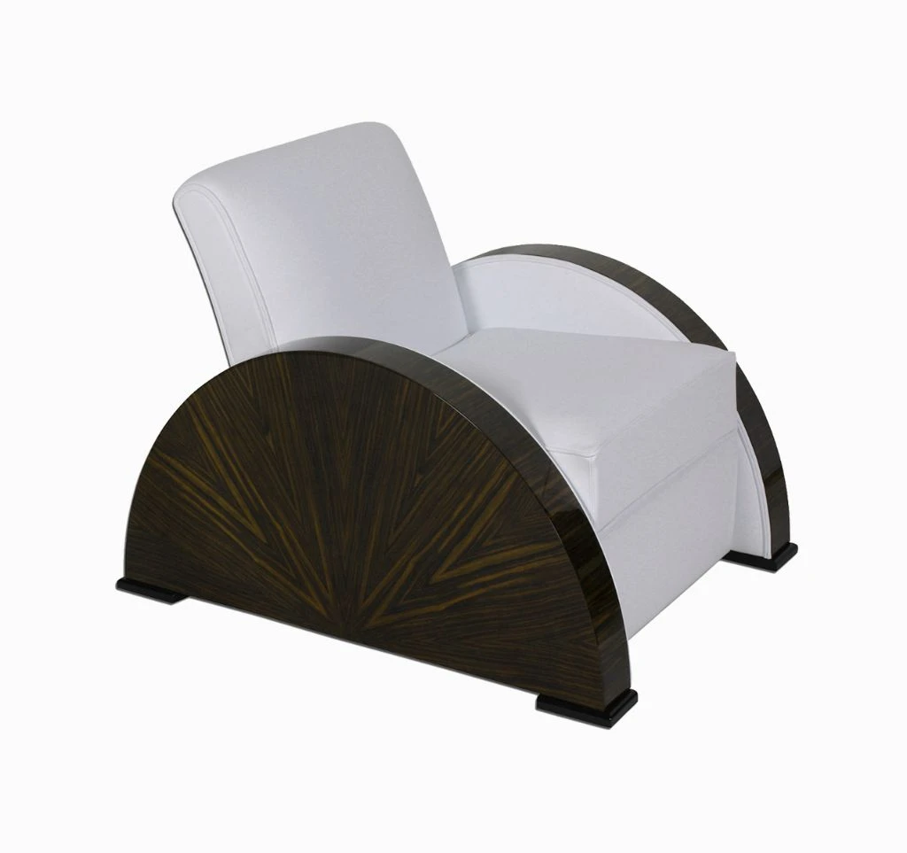 The semi-circular solid side panels with Macassar star veneer are the distinguishing feature. The soft, round shape make for the Art Deco character. Simply unique!