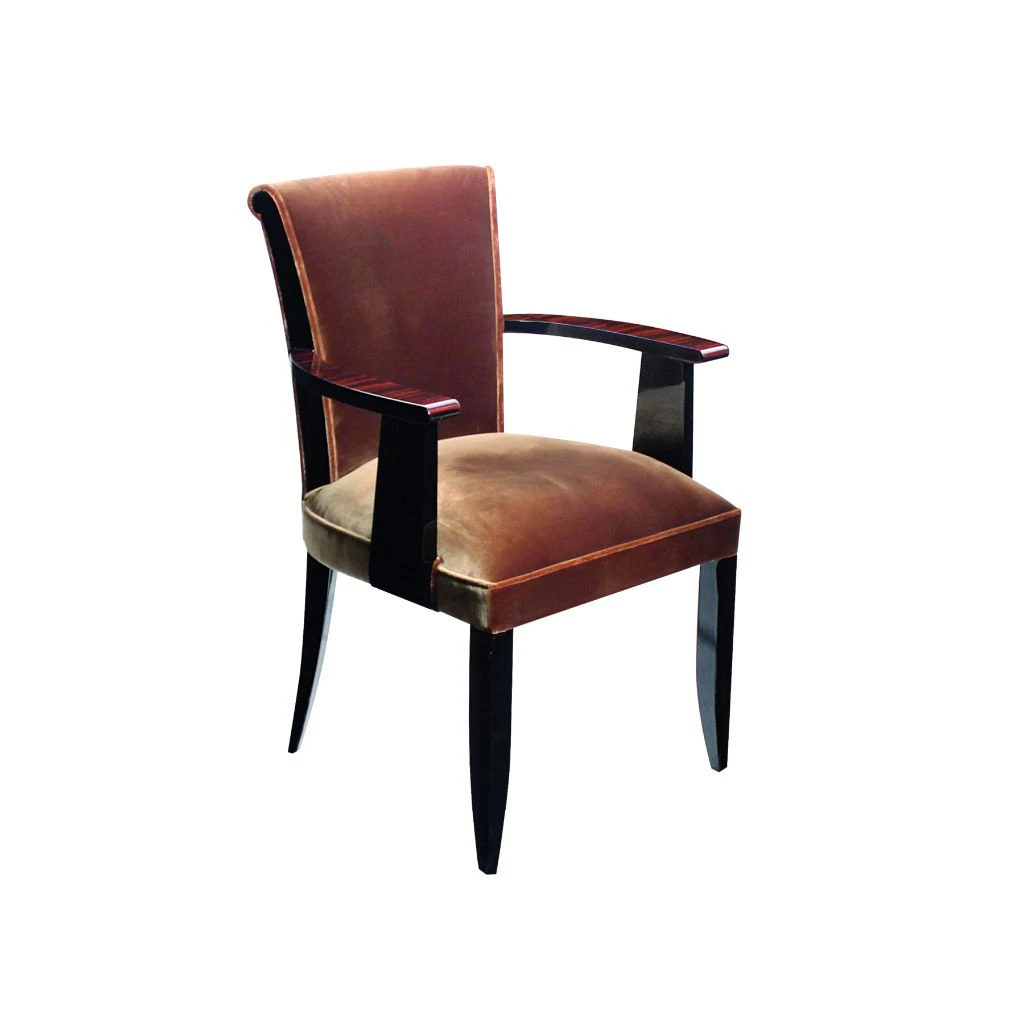 Versatile Art Deco armchair. One of our most popular chairs, because it is as comfortable as attractive. Macassar armrest with black high gloss body, leather or fabric upholstery. The matching side chair to this model is ST025.