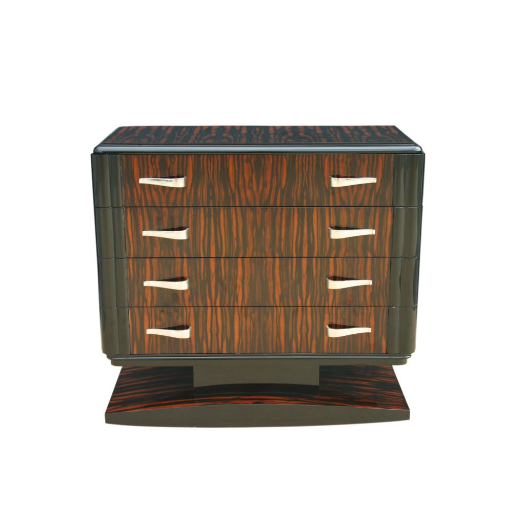 The characteristic feature of this art deco chest of drawers are rounded profiles, which extend to the outer edge of all four drawers. The details are high gloss black. 4 drawers.