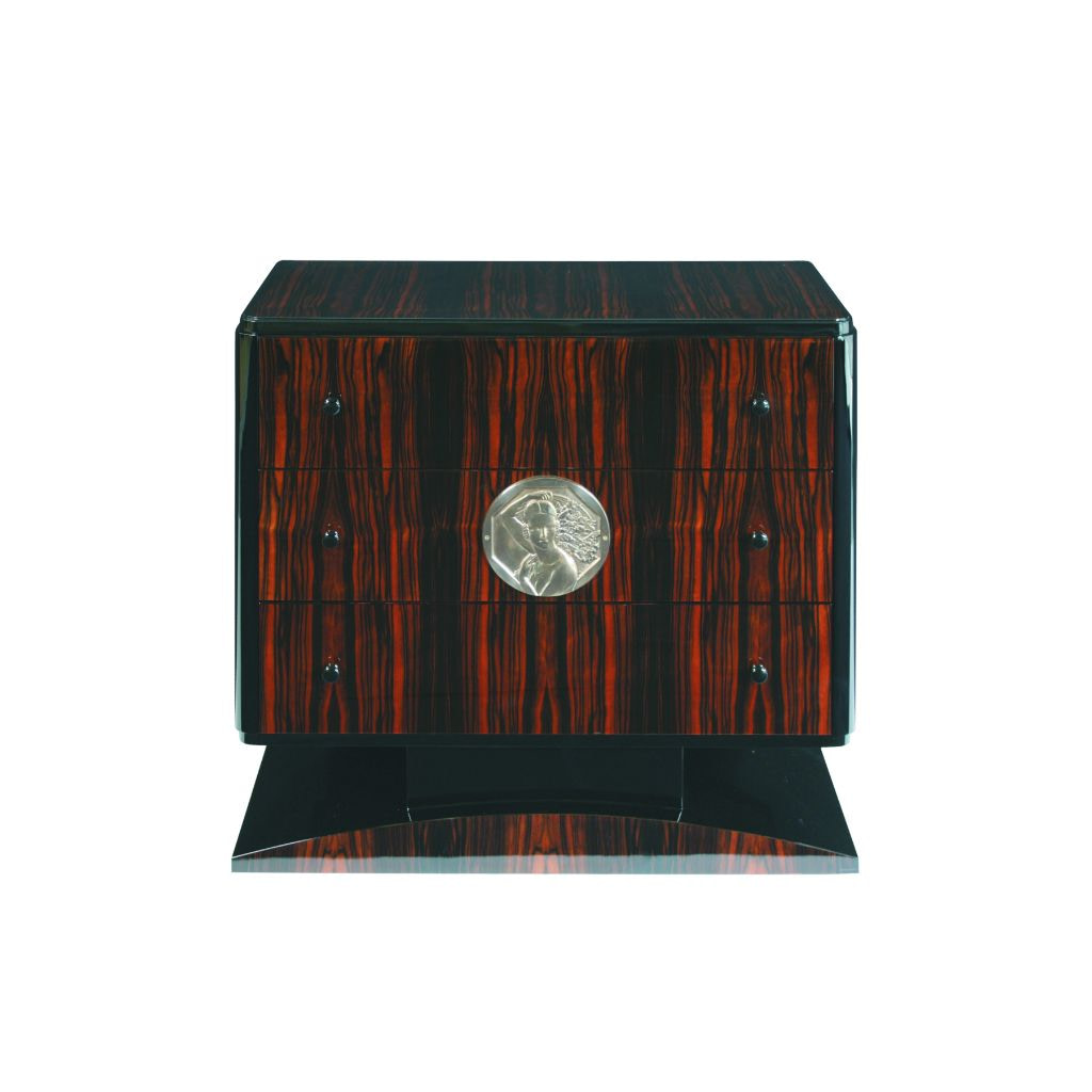 Beautiful Art Deco dresser with nickel or brass plaque. Its motif of a female bust is typical of the era